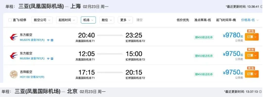 据界面新闻2月22日报道,多家在线旅游平台数据发现,2月22日至23日(初六至初七)期间,从三亚飞往北京、上海等核心城市的直飞航班经济舱几乎售罄,仅剩的公务舱票价普