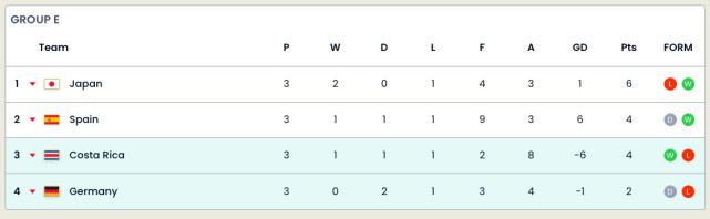 本轮之前,西班牙4分排名第一,日本和哥斯达黎加都是3分,前者净胜球占优,德国1分垫底。