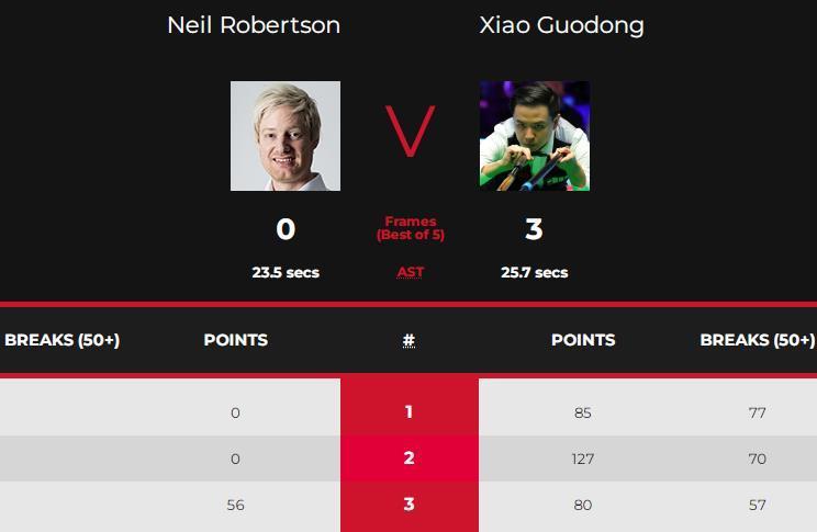 面对世界冠军尼尔·罗伯逊,肖国栋绝地反击,连续打出单杆77分、70分、57分,比赛的前两局全部零封尼尔·罗伯逊,最终以3-0大获全胜,爆出了大冷门。拿到这场胜利后,肖国栋将首日的战绩锁定为1胜2负,虽然暂时排名垫底,但是肖国栋保留了晋级小组前四的希望,毕竟接下来还有三场比赛,对手依次是凯伦·威尔逊、约翰·希金斯、斯图尔特·宾汉姆。