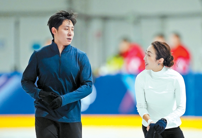 隋文静(右)、韩聪在训练中