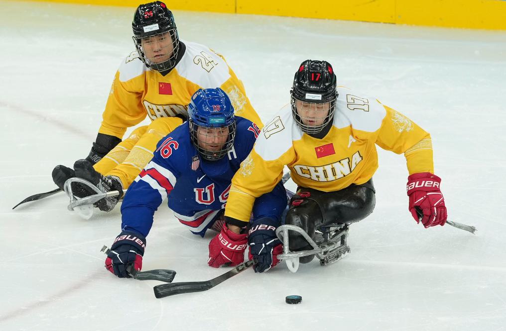 3月10日,申翼风(右)在比赛中拼抢。当天,在意大利米兰举行的米兰-科尔蒂纳冬残奥会残奥冰球小组赛A组比赛中,中国队1:7不敌美国队。新华社记者侯俊 摄