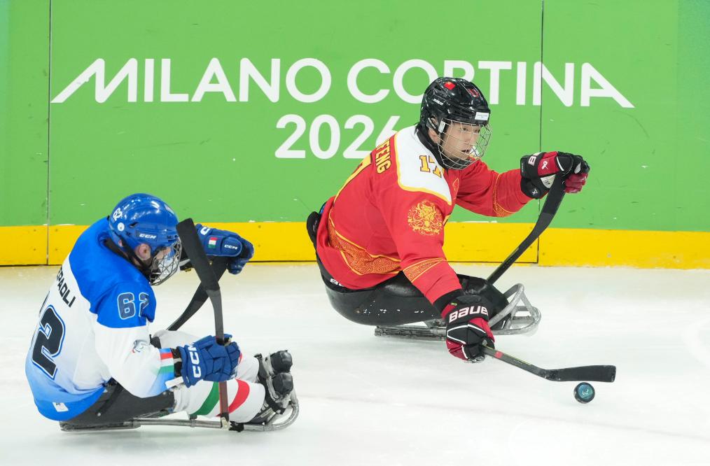在2026年米兰-科尔蒂纳冬残奥会残奥冰球赛场上,冰橇疾速滑行,球杆不断击打冰面,攻防转换快速激烈。27岁的中国残奥冰球队运动员申翼风与队友并肩作战,这是他第二次站上冬残奥会的舞台。