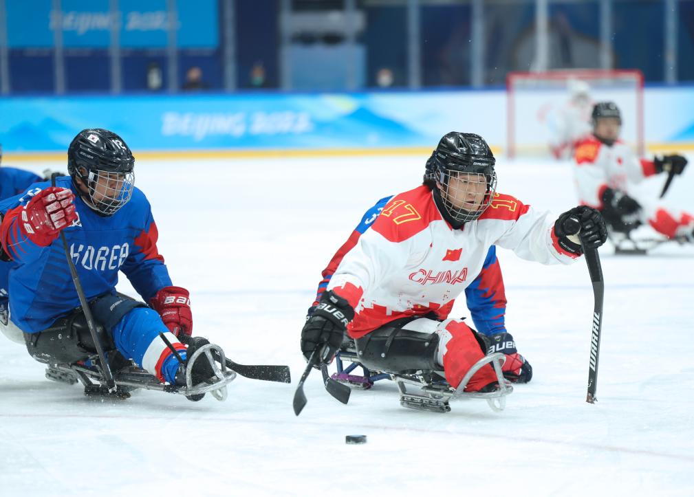 2022年3月12日,在北京国家体育馆举行的北京2022冬残奥会残奥冰球铜牌赛中,中国队以4:0战胜韩国队获得铜牌,图为申翼风(右)在比赛中进攻。新华社记者兰红光 摄
