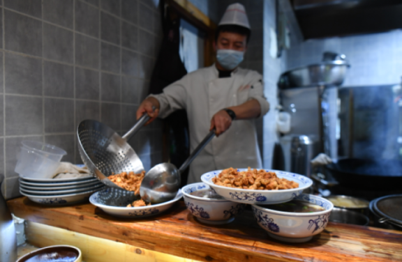 西宁市一餐饮店厨师忙碌烹饪青海美食。