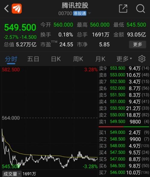 腾讯控股港股今日盘中跌幅达3.28%,收盘每股报549.5港元,跌幅达2.57%。