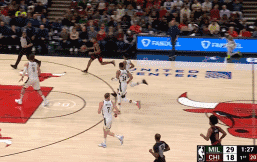 公牛进攻,雄鹿桎梏防守将对手进攻摁在接近24秒进攻违例,科比-怀特强突上篮,字母哥紧跟身后试图封盖,结果,他的右手拍到篮板上受伤,随后直接返回更衣室,布登霍尔泽直接将大洛派回赛场,效果: