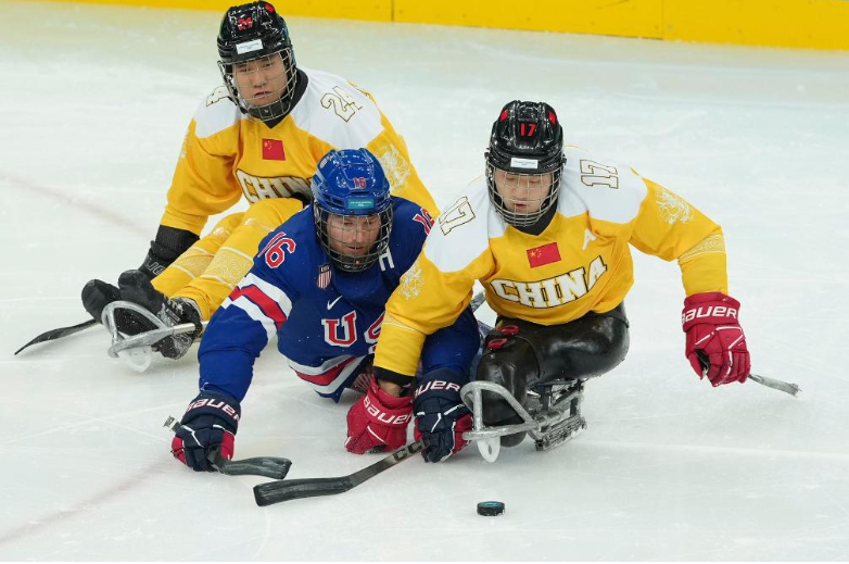 在2026年米兰-科尔蒂纳冬残奥会残奥冰球赛场上,冰橇疾速滑行,球杆不断击打冰面,攻防转换快速激烈。27岁的中国残奥冰球队运动员申翼风与队友并肩作战,这是他第二次站