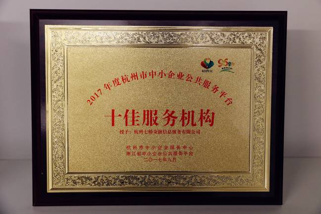 七桥多年来致力于企业服务,于2017年9月荣获 “2017年度杭州市中小企业公共服务平台十佳服务机构” 称号。据了解,浙江省中小企业公共服务平台、杭州市中小企业公共服务平台自2017年8月1日开始在全市服务机构开展了2017年度杭州市十佳服务机构评选活动,经过报名、初审、大众投票、专家组评议、公示五个阶段,最终选出10个十佳服务机构和7家优秀服务机构。