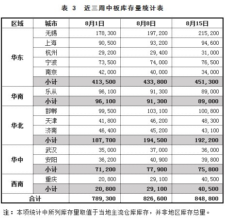 ◆无锡 8月15日,同口径库存增加1.80万吨,环比增长9.13%;无锡中板市场本周到货量较大,市场价格上涨,整体成交偏弱,库存持续上升,再创新高。