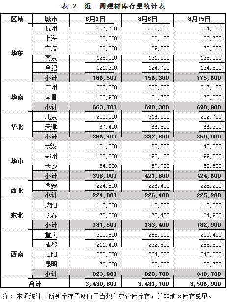 ◆杭州 8月15日,上述同口径库存增加0.06万吨,环比增长0.17%;杭州建材市场本周到货量较上周基本持平,升华码头已到港待卸船只10多条,高温对当前需求产生一定影响,出库量有所减少。