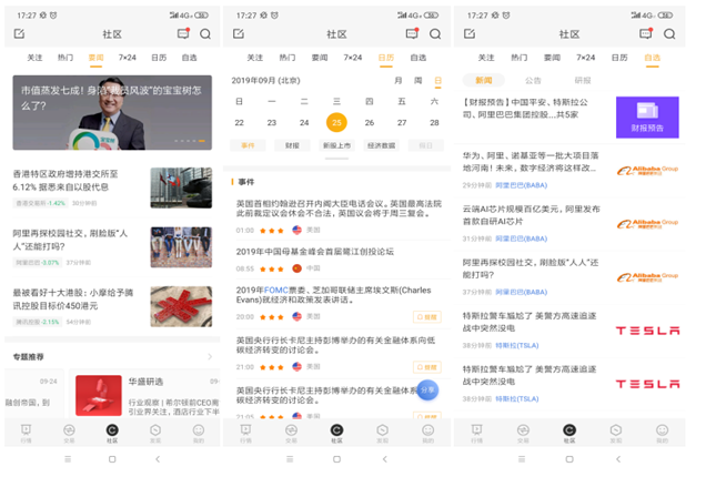 如果大家精力有限无法时刻跟踪关心的个股动态,社区的“自选”频道,会及时跟新个人已买入或者加入自选的个股信息,包括新闻动态、公司公告、以及各大机构发布的最新研报。特别到了财报季这个特殊时期,股价往往会随着财报的发布前后有较大波动,不想错过投资良机,可以通过“日历”频道,随时查看每天有哪些公司发布了财报,同时还可获取到当天的重大事件、新股上市动态、全球最新经济数据以及股市休市安排。