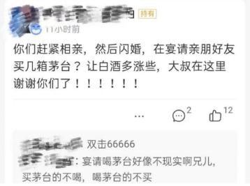 评论中还有神回复:你们赶紧结婚,宴请好友多买白酒,让它再涨些!