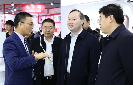 丹阳市委副书记、市长黄万荣(右二),副市长刘宏程(右一)、黄俊杰(左二)参观明月镜片展台