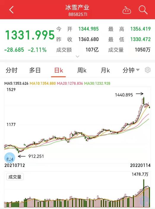 数据显示,自2021年12月以来,截至1月14日,冰雪产业板块累计涨幅达21.14%。代表股莱茵体育,股价自2021年12月27日起开始腾飞,至1月6日现8连涨,期间涨幅达57.36%。
