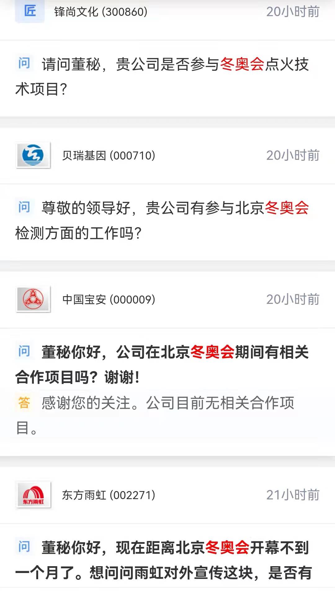在上交所和深交所互动平台上,近期投资者密集询问上市公司,是否有参与到冬奥会项目中。