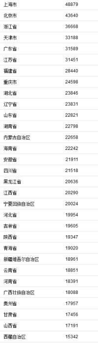“3万元梯队”的竞争则更为激烈一些。浙江、天津、广东、江苏分别以36668元、33188元、31589元、31451元的成绩位列三到六位。