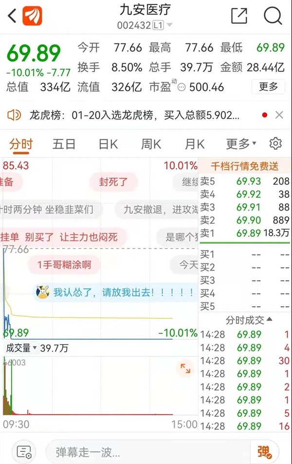 1月21日,九安医疗开盘不久即跌停,这是公司最近4个交易日遭遇的第二个跌停。经历十倍涨幅后,九安医疗近期股价出现剧烈波动,投资者也犹如坐上了一列俯冲向下的过山车,在其个股界面上,各式各样的弹幕也密集了起来。