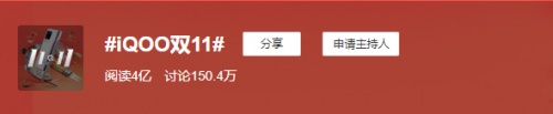 此外,在社交媒体平台微博上,iQOO发起诸多话题活动,反映相当热烈。比如#iQOO双11#的话题,到现在阅读量已经超过了4亿;#周深的声音礼物#微博话题,阅读量也达到了1亿。