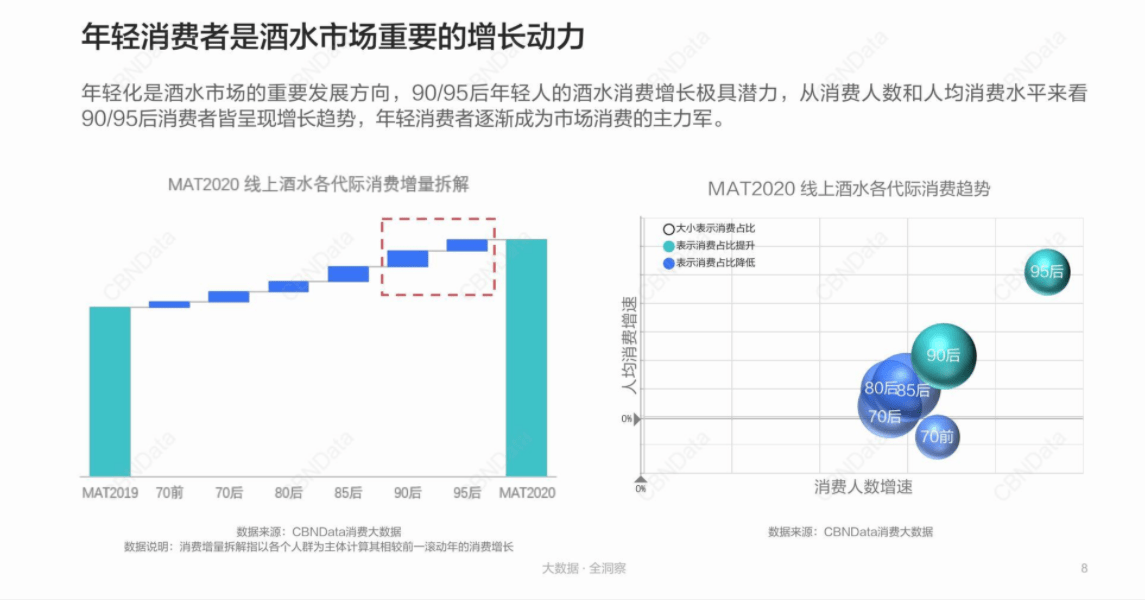 据天猫新品创新中心发布的《2020果酒创新趋势报告》数据显示,截至2020年尾声,国内梅酒消费同比增幅为90%,而预调鸡尾酒与果酒的增幅为50%。显而易见,味觉体验丰富、低度酒销量迅猛增长,究其原因,无疑是逐渐具有消费能力和话语权的年轻人在行使“消费”投票权。
