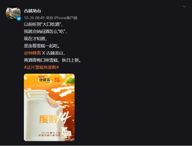 同时,“国货崛起”的风潮也席卷了各个行业。在酒饮领域,国潮品牌与其它各类品牌也在角力之中。10月下旬,百威中国便上市了两大低度酒饮品牌,似乎在与此对抗,国货品牌也在发力抢占市场。古越龙山作为国内老牌的黄酒品牌,近日联手知名国货冰品品牌钟薛高,诞生了黄酒青梅雪糕。在这条竞争激烈的新酒饮赛道上,近几年表现亮眼的国货品牌依然可圈可点,演绎着从内容到形式上不倦的产品创新。