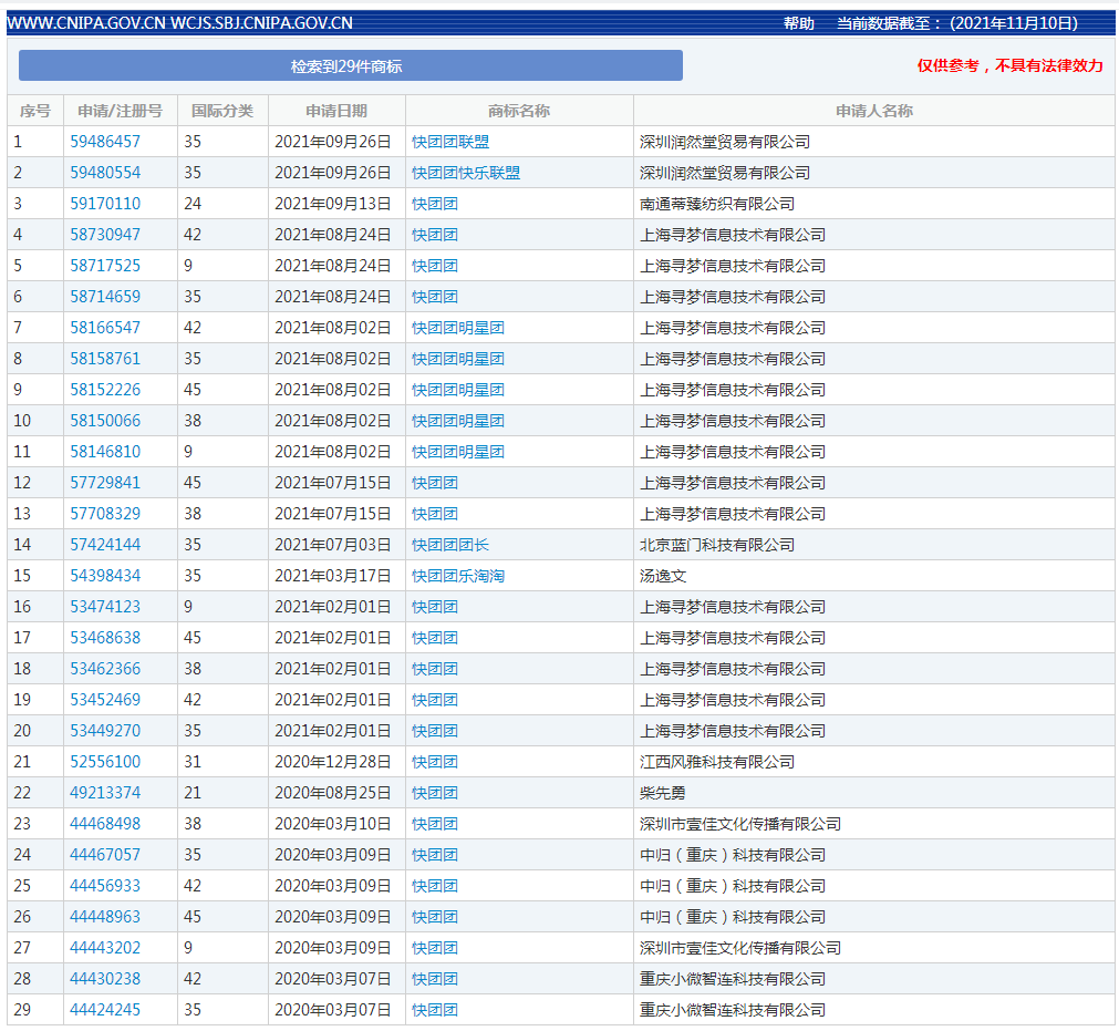 检查了一下,快团团的公司拼多多:上海寻梦信任技术有限公司申请的9类、45类、38类、42类、35类均被驳回,……
