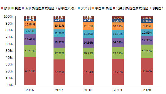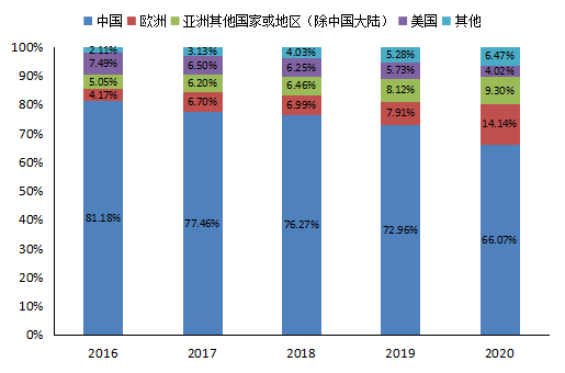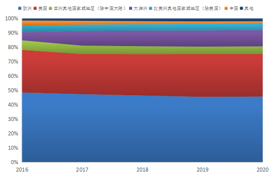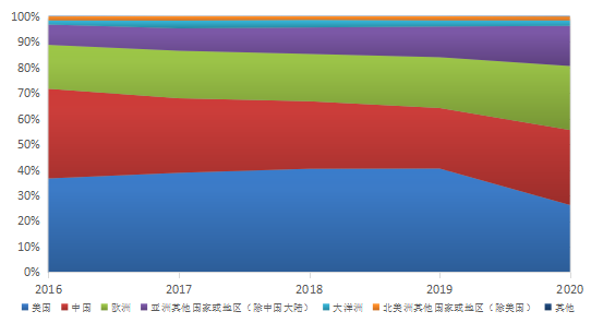 G100 毕业生就业所在国家和地区分布变化(2016-2020年)