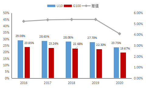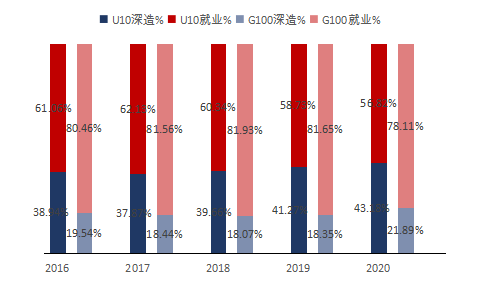 U10及G100毕业生平均国际迁移情况对比(2016-2020年)