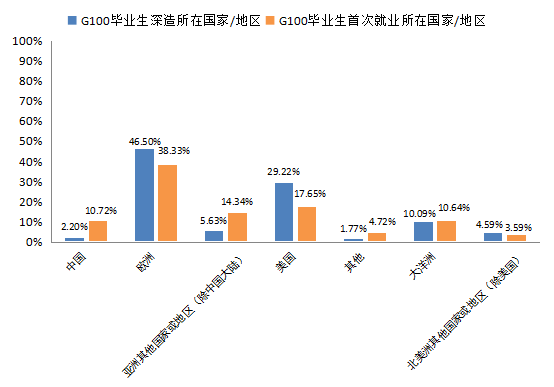 与U10 毕业生相比,G100 毕业生深造与首次就业所在国家和地区分布大致相同,高度集中于欧洲和美国。然而,选择前往亚洲(包括中国大陆在内)进行首次就业的毕业生占比远高于深造占比;其中,到中国深造的G100 毕业生比例仅为2.2%,而在中国就业的人数高达10.72%。这尽管在一定程度上反映出中国高等教育质量和声誉仍需进一步提高的现状;但另一方面考虑到中国现行较为严格的工作居留与签证限制,这也说明中国经济社会的高速发展得到国际社会的高度认可,中国就业市场从而对全球高校毕业生存在较强的吸引力。