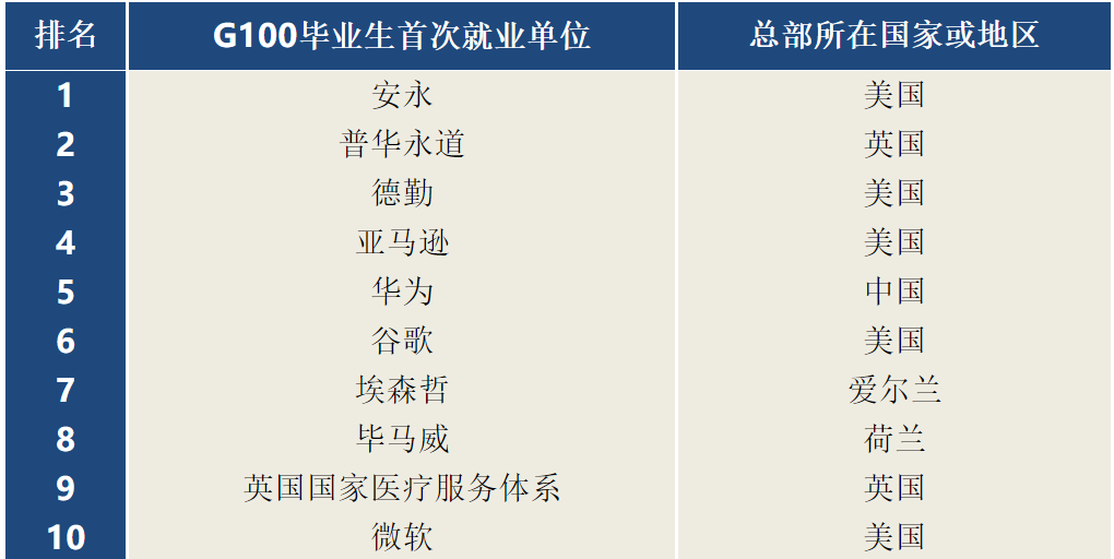 全球G100毕业生更多选择在金融和咨询行业发展,华为成为全球G100毕业生雇主选择Top10中的唯一中国企业。
