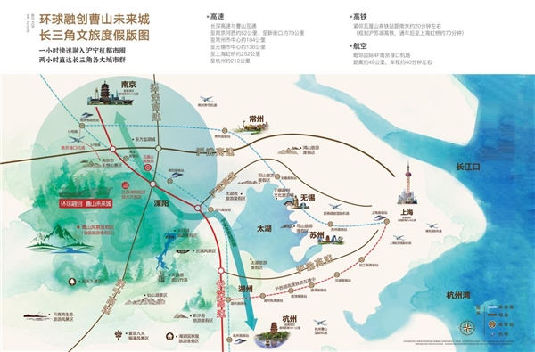环球融创曹山未来城地处长三角几何中心,紧邻G25长深高速,可快速通达南京等长三角城市群其他城市;紧邻宁杭高铁瓦屋山站,随着规划的“沪苏湖”高铁线路全线通车,未来将大大缩短项目距离上海、苏州及杭州的距离。全维立体式的交通网,快速通达长三角城市群。