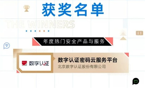 12月1日,WitAwards 2021中国网络安全行业年度评选获奖名单新鲜出炉,北京数字认证股份有限公司的密码云服务平台荣膺“年度热门安全产品与服务”殊荣。