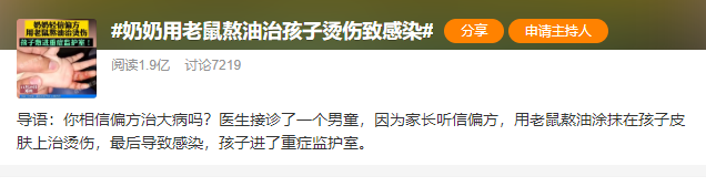 牙膏鸡蛋清治疗烫伤、生吞蝌蚪强身健体、皮肤涂墨水消除疱疹......各种神奇“偏方”经常听说,那到底有没有用呢?近日,发生在河南儿童医院的一件事儿,似乎给出了答案——孩子奶奶听信“偏方”,竟用老鼠熬油涂抹在孩子的皮肤上治疗烫伤,最后导致感染,把孩子“治”进了重症监护室。一番让人窒息的离谱操作直接震惊全网,吸引了近2亿人前来关注。网友直呼:“我听着就害怕”。