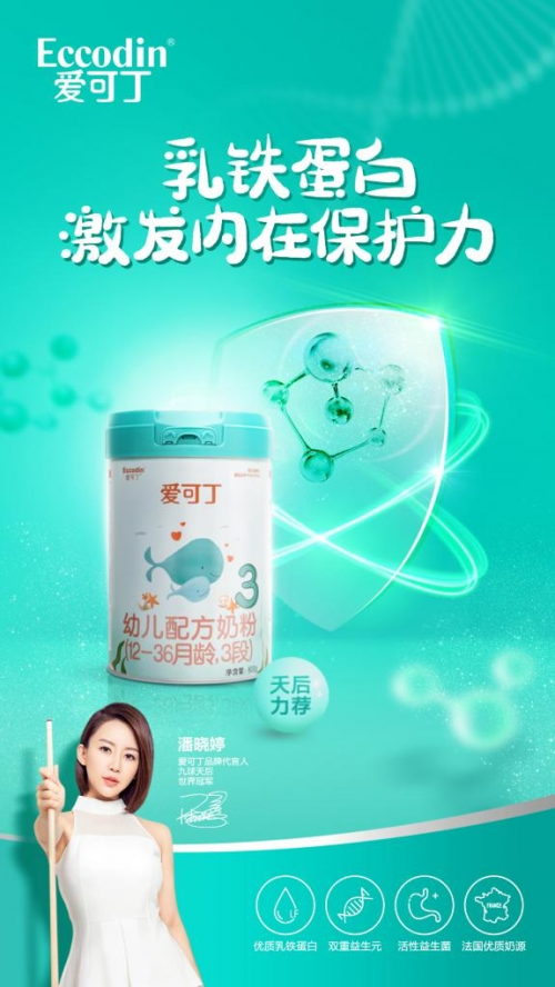 2020年爱可丁签约世界台球冠军·九球天后潘晓婷为品牌代言人。潘晓婷一直坚守专注的精神,她身上所体现出的专业、敬业的冠军精神与爱可丁的品牌理念不谋而合。未来,爱可丁将会乘风破浪,深度品牌赋能,携手九球天后潘晓婷,为中国宝宝健康加分!