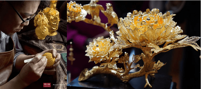 拿周大福大师工作室传承的花丝镶嵌工艺来说,它是中国非物质文化遗产之一,始于春秋战国时代,历经千年、渊源久远。周大福资深工匠师傅用金、银等为原料,采用掐、填、攒、焊、堆、垒、织、编等技法,将金属条经过十几次拉制,拉出比头发还要纤细的丝,制成千姿百态的造型,并采用上十种技法,才雕琢出这些如同跨越时空,将历史与传统神髓重现于现代的艺术珍品。