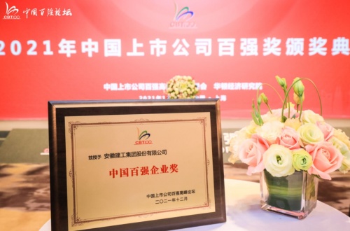 12月4日,在“第二十一届中国上市公司百强高峰论坛”上,安徽建工凭借强大的经营规模和强劲的盈利能力,从沪深两市4500余家上市公司中脱颖而出,荣膺“2021年中国上市公司百强企业奖”。