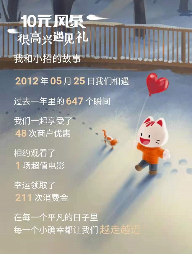 首先是“遇见礼”,活动期间登录掌上生活App即可获得一份“很高兴遇见礼”,100%有奖,奖品包含最高2022元消费金、最高88元商城券、饭票影票抵用券、话费充值券等。与此同时,持卡人能收获在过去一年中,自己与招行信用卡相遇、相伴、相助的故事。