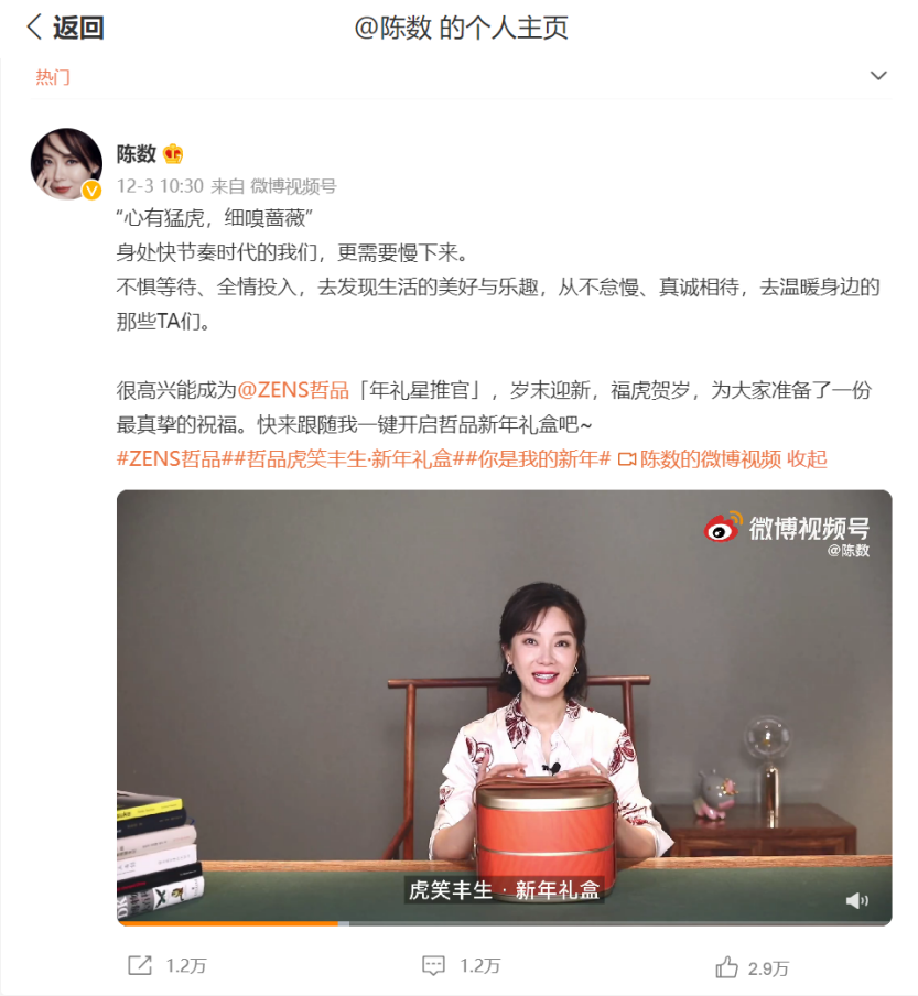 2021年12月3日,全球知名茶器、家居和生活方式品牌ZENS哲品,正式宣布实力演员陈数成为品牌年礼星推官。官宣当日,陈数首发为哲品“虎笑丰生新年礼盒”进行开箱,契合礼盒本身“你是我的新年”的灵感,向大家送上最真挚的新年祝福,唤醒幸福年味。