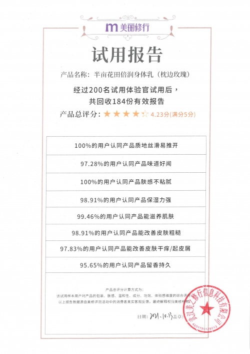历经28天功效实验,半亩花田倍润身体乳(枕边玫瑰)顺利通过了老爸抽检专业测评团队的认证,证实了半亩花田倍润身体乳的保湿效果有效,并获得了老爸抽检商标的授权。