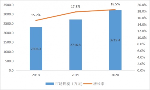 近年来,随着各地区数字政府建设进程不断加快,政务数据量呈指数级增长。随着对财政治理体系和治理能力现代化建设的要求不断提高,财政行业数据服务市场需求迅速增长,2018-2020年三年来增长率保持在两位数以上,2020年市场规模达到3219.4万元,增长率达到18.5%。