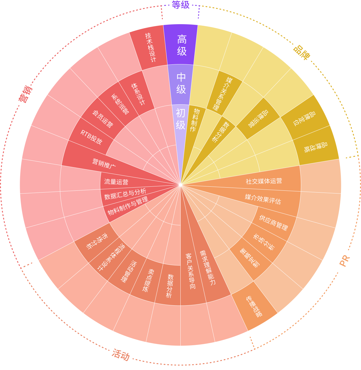 人才层面,赛诺贝斯基于自身16年数字营销沉淀,贴合中国营销环境的能力测评体系,绘制出数智化人才飞轮,将数智化人才分为品牌、公关、活动、营销四大类,每一类再细分为初级、中级、高级三个等级,详细归纳出每一类、每一等级的人才应具备哪些能力,帮助企业更有针对性地进行人才体系建设。