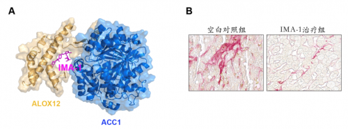 图A. IMA-1抑制ALOX12和ACC1蛋白互作结构图;图B. IMA-1治疗脂肪肝炎效果(红色染色区域代表肝脏纤维化程度)