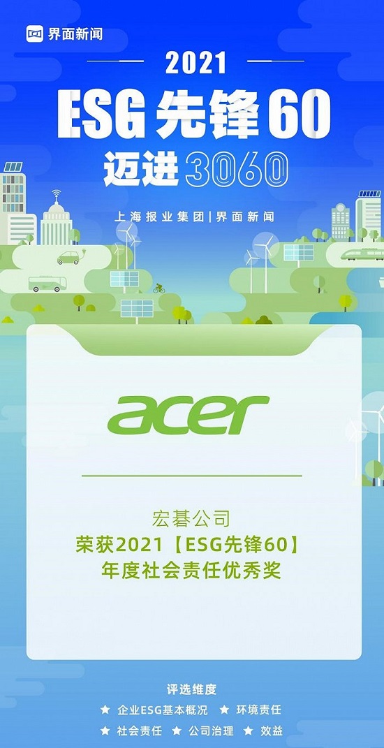 12月15日,上海报业集团|界面新闻在正式公布了2021【ESG先锋60】本年度获奖名单宏碁公司凭借永续创新的经营理念和实践成果摘得【ESG先锋60】年度社会责任优秀奖。