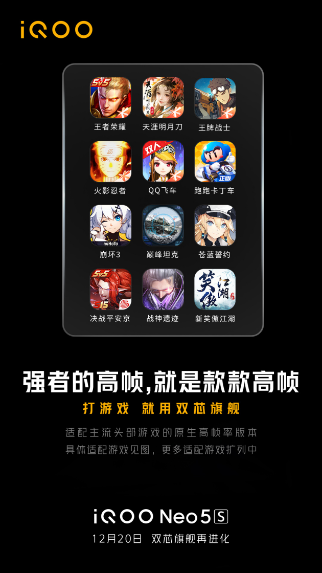 从官方的预热图来看,目前该机已经适配了包括《王者荣耀》、《天涯明月刀》、《崩坏3》等12款高帧游戏,由于目前该机仍未发布,后续还会对更多的游戏进行适配,因此在发布之后,iQOO Neo5S很有可能会成为今年高帧游戏适配数量最多的手机。