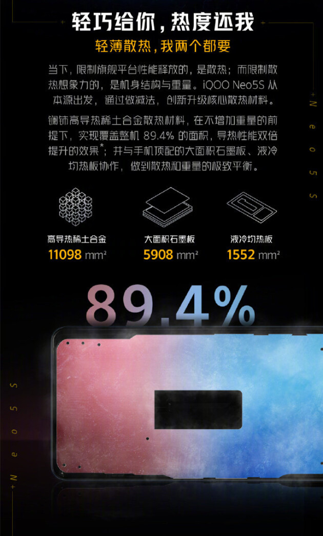 iQOO则在新机上给出了一种全新的材料方案——高导散热稀土元素。与此同时,iQOO Neo5S的散热材料实现了89.4%的整机覆盖率,导热性能方面直接翻倍,达到原来的200%,从