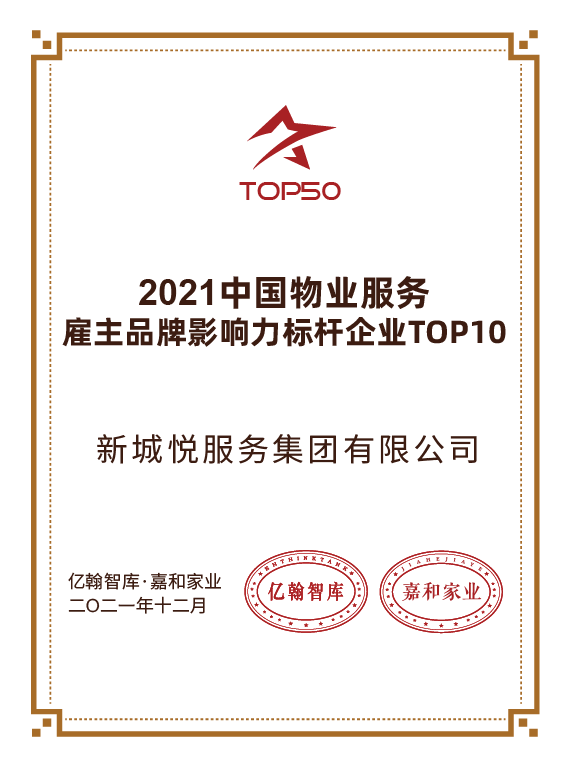 2021年12月16日,由亿翰智库?嘉和家业物业服务研究院主办的“2021年度中国物业服务企业服务力研究”发布会于广州举办。新城悦服务从众多企业中脱颖而出,获评“2021中国物业服务雇主品牌影响力标杆企业TOP10”。此举意味着新城悦服务凭借优秀的人力资源管理理念、完善的内部人才培养机制和优质的雇主品牌形象获得行业认可,也是新城悦凭借多年来持续投入人力资源战略与组织建设的最佳印证。