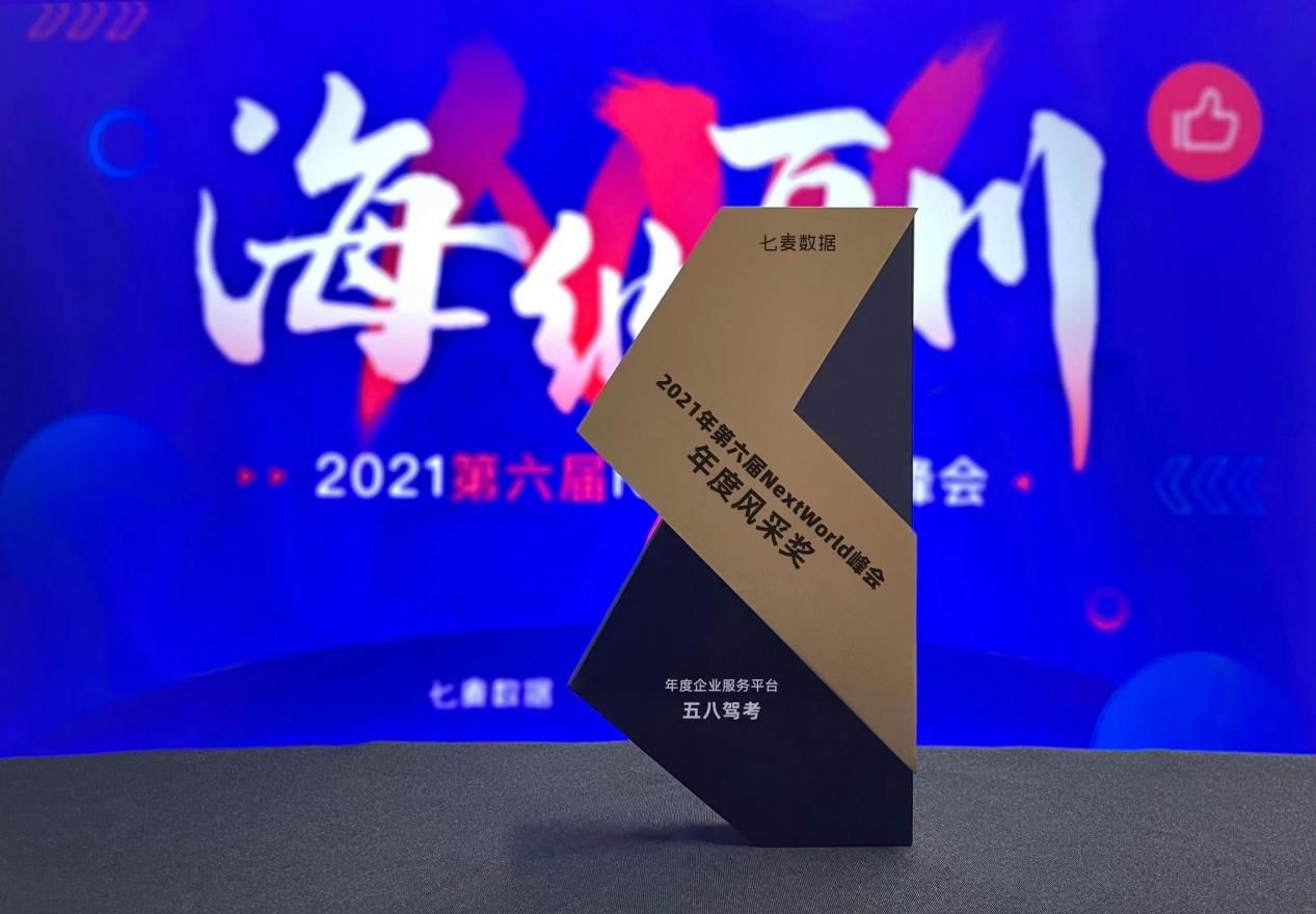 12月13日,由国内专业的移动应用数据分析平台“七麦数据”主办,众多投资机构、媒体等联合发起的“NextWorld2021年度风采奖”获奖名单公布,榜单旨在表彰本年度在互联网领域不断创新、追求卓越的优秀企业和品牌,共评选出“年度风采应用大奖”、“年度风采游戏大奖”、“年度风采企业服务平台”三大奖项,其中,五八驾考斩获“年度风采企业服务平台”奖项。