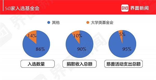 今年上榜的大学类基金会有7家,与去年相比,数量相同,但是成员稍有变化。上榜的7家大学类基金会分别是北京大学教育基金会(第11名)、天津南开大学教育基金会(第11名)、山东大学教育基金会(第35名)、北京理工大学教育基金会(第41名)、北京师范大学教育基金会(第45名)、四川大学教育基金会(第45名)、西北工业大学教育基金会(第45名)。其中,山东大学教育基金会和西北工业大学教育基金会为今年的新成员。从财务数据来看,这7家大学类基金会的捐款收入总额和慈善活动支出总额分别为19亿元、12亿元,占前50家基金会捐款收入总额和慈善活动支出总额的10%、5%。