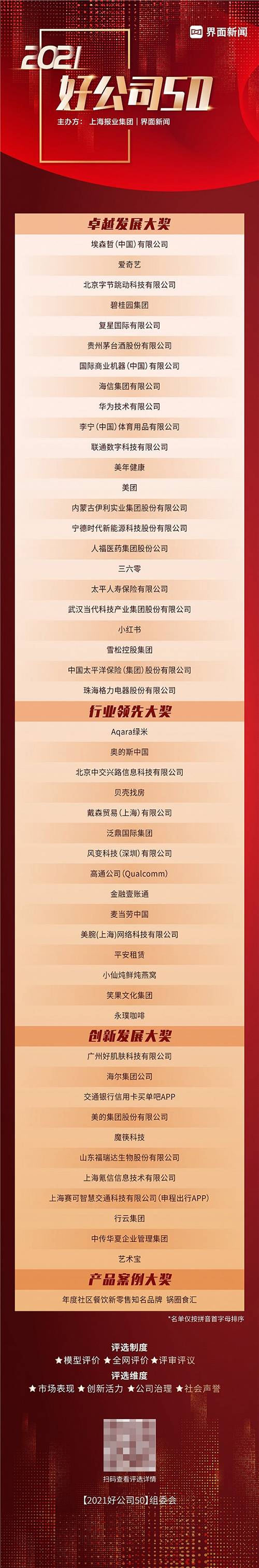 12月15日,【界面财经年会】颁奖盛典上隆重公布了2021【好公司50】获奖名单(*按首字母排序)——