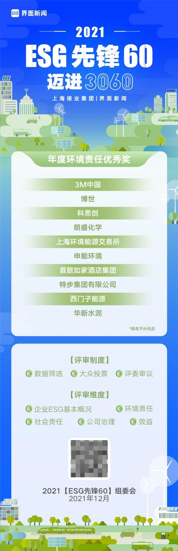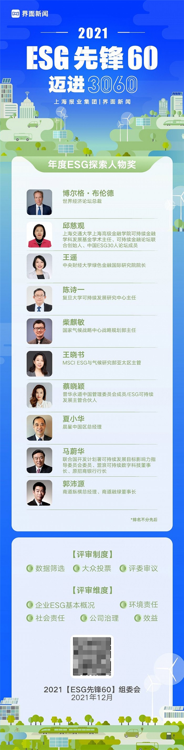 由上海报业集团|界面新闻发起的2021【ESG先锋60】评选于12月15日在沪正式公布获奖名单,来自各行各业的50家绿色先锋企业以及10位先锋探索人物共同荣获此项年度大奖。多家龙头企业、行业标杆齐聚本次颁奖盛典,共同展望2022,助力企业绿色转型,朝着“3060”的目标不断前进!