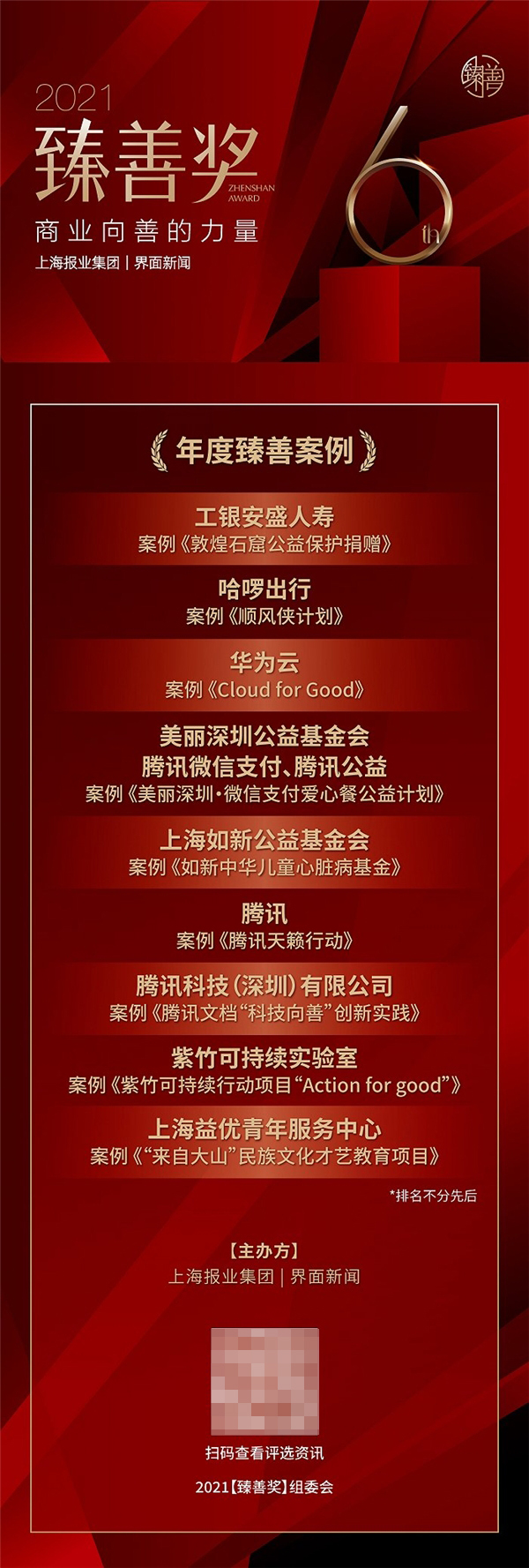 经历了为期数月公正、公开的严格评选,最终,共有30家企业荣获“年度臻善企业”大奖,5位企业领袖获评“年度臻善领袖”,9则优秀案例获评“年度臻善案例”,4位公众人物荣膺“年度臻善之星”称号。
